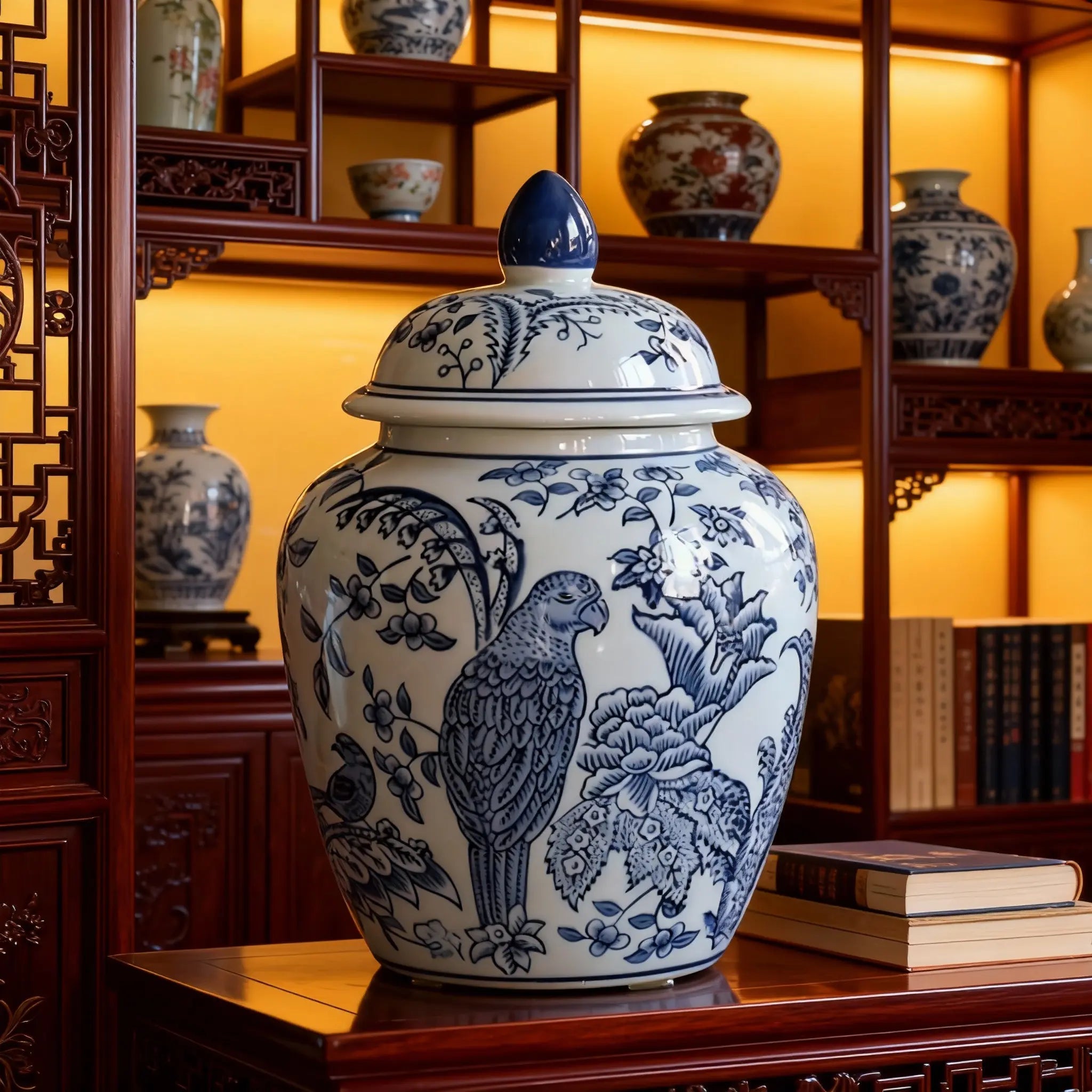 This exquisite Blue and White Porcelain Lidded Jar embodies traditional Chinese craftsmanship, merging decorative allure with functional design. Adorned with intricate floral and avian motifs (including a detailed parrot), its classic blue - white palette and delicate, hand - painted - style detailing evoke timeless Oriental charm. Crafted from premium porcelain, the jar features a secure, finial - topped lid, ideal for storing small treasures (jewelry, trinkets) or serving as a standalone decorative accent. Perfect for enhancing living rooms, studies, or entryways, it adds a refined cultural touch to any space. Whether gifting to antique - style decor enthusiasts or curating your own collection, this jar seamlessly blends heritage artistry with modern interior aesthetics, offering both beauty and practicality in one elegant piece.