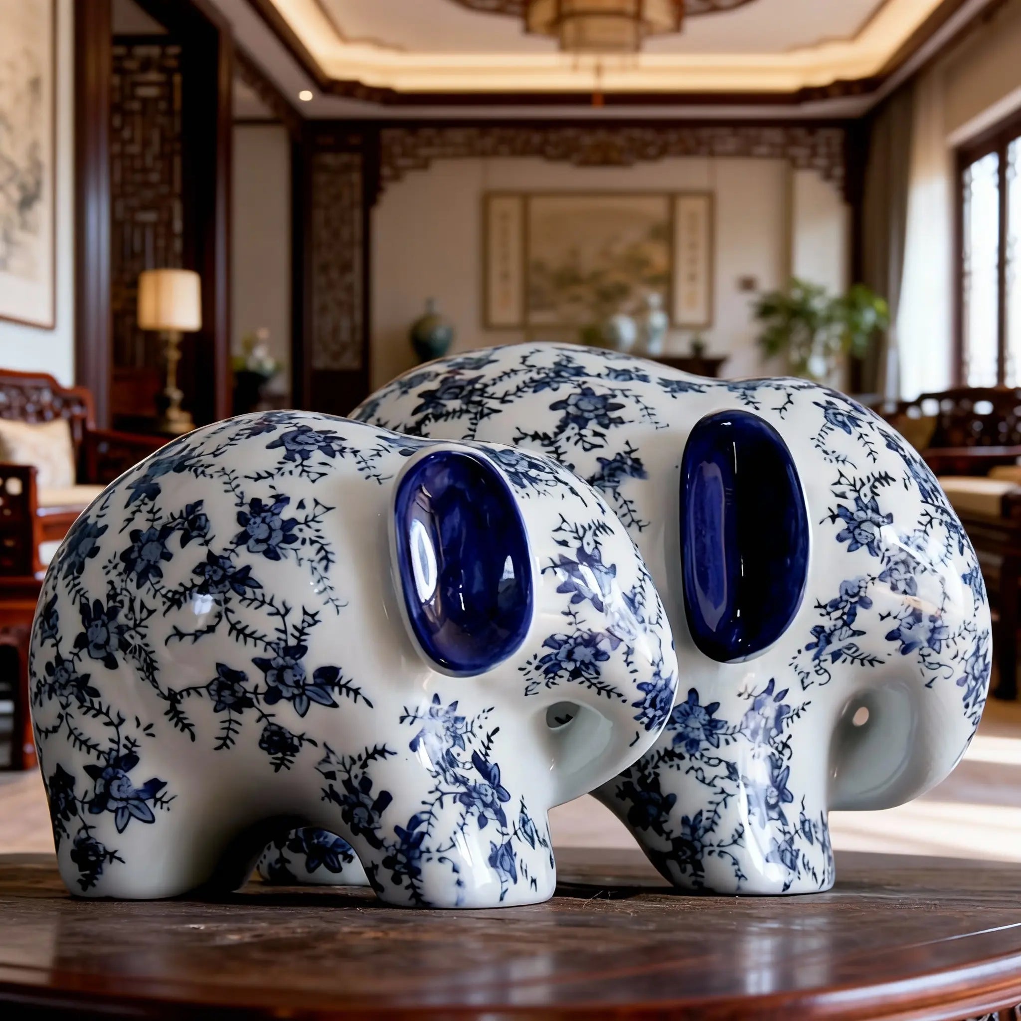 These Chinese blue - and - white porcelain elephant figurines showcase exquisite traditional craftsmanship. Adorned with delicate blue floral motifs on a pristine white porcelain base, they embody the timeless elegance of classic blue - and - white ceramics. The charming elephant silhouettes, featuring glossy blue inner ears and smoothly curved trunks, add a whimsical yet refined touch. Perfect for home decor, they enhance living rooms, studies, or bedrooms with a blend of cultural artistry and aesthetic appeal. Additionally, they make thoughtful gifts for art enthusiasts, collectors, or anyone who appreciates Eastern heritage. Meticulously crafted, these figurines not only serve as decorative accents to elevate interior spaces but also carry the rich cultural legacy of Chinese porcelain, making them a versatile and meaningful addition to any setting or a heartfelt present for special occasions.